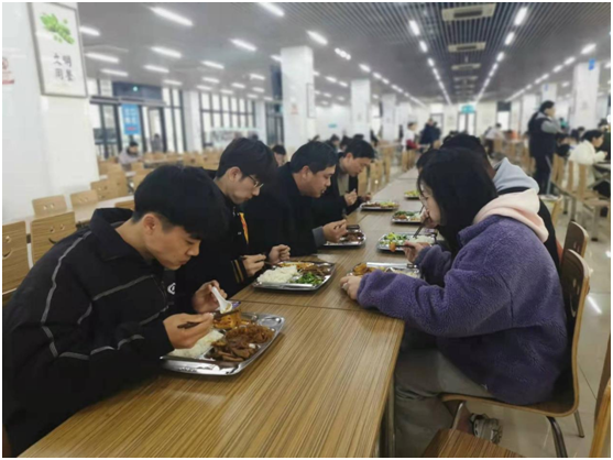 在员工食堂,程利群与员工一起排队打饭,边吃边聊,关切地询问员工们的学习和生活情况,勉励大家要加强学习、提高技能、不断成长。员工们也非常开心地向程利群汇报自己的大学目标和毕业后设想。师生围桌而坐,气氛温暖融洽。