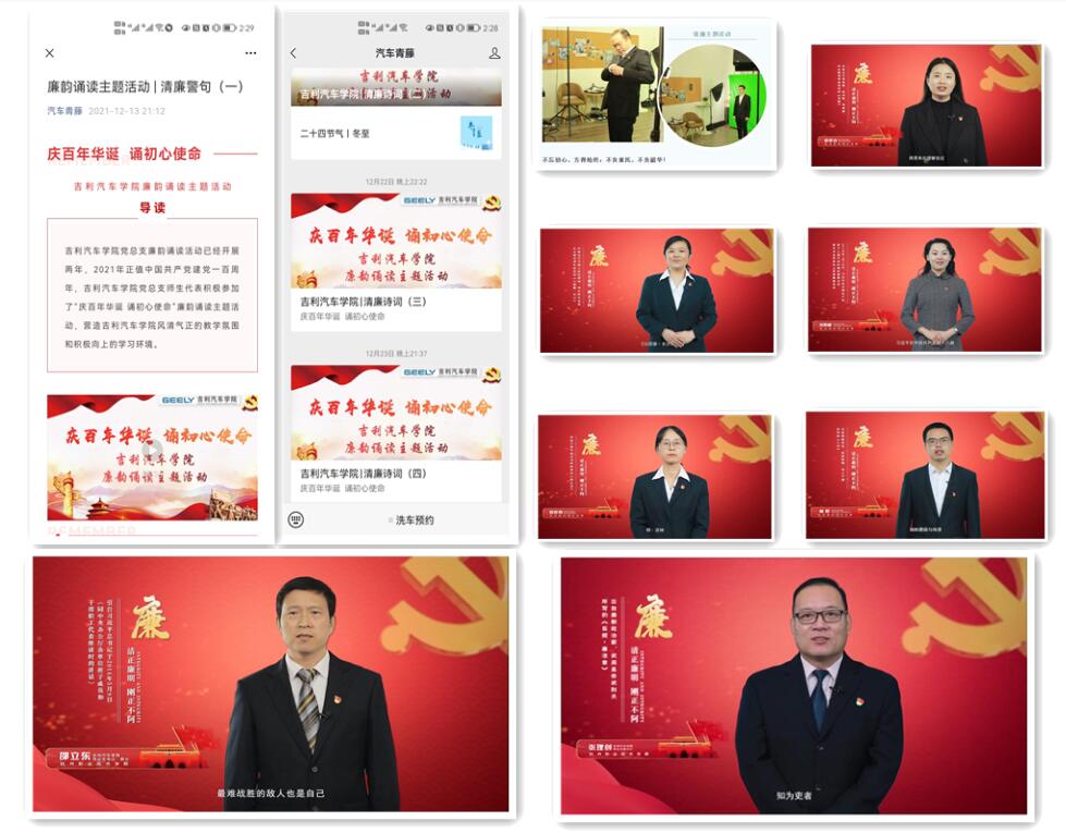 12月28日,吉利汽车公司党总支“庆百年华诞 诵初心使命”廉韵诵读主题活动圆满结束。正值中国共产党百年华诞,吉利汽车公司党总支师生以诵读“清廉警句”、“清廉诗词”、“清廉故事”的形式,重温入党誓词,诵读初心使命,激励奋斗精神,保持廉洁之心。活动以党员教师独诵和师生合诵的形式开展,录制视频并发布公众号推文九期,每期推文均以“廉韵诵读”活动背景介绍、师生诵读视频展示、诵读材料背景介绍和党风廉政建设大事记为主要内容展开。本次活动从组织策划到材料选编,从师生诵读视频录制到公众号推文全部发布,历时近一个半月,活动开展期间得到了学校纪委和分院领导的悉心指导,分院教职工和员工参与热情高,诵读作品的公众号推文获得师生好评,并获得学校纪委官方微信公众号转载。