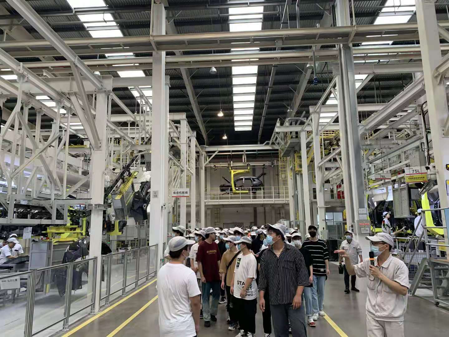 广汽传祺车间有四个车间,分别是总装车间、涂装车间、焊装车间、冲压车间。同学们先来到了焊装车间,观察到车间内每个区域都进行了划分,整齐不乱,每个操作工序都与智能机械配合完美。工作人员详细介绍每一个步骤,让同学们了解工作人员是如何和大型机械互相合作的,焊装的每一个步骤都如此的精细,一环接一环,并有严格的部件检查流程。