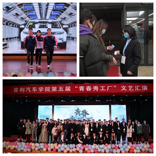 为做好大型活动的防控工作,保证活动的有序开展,本次晚会开始前确认观众带好口罩、体温正常方可进入会场,严格将晚会人数控制在300人内,并实行了座位间隔就座。“青春秀工厂”不仅是青年老员工风采的展示秀,也是分院员工文艺的盛会。节目形式多样、精彩纷呈,包含了钢琴独奏、舞蹈、朗诵、小品、相声、合唱、情境式走秀等。师生朗诵《因为有你》让全场观众再一次为伟大的抗疫精神所感动;小品《相亲》用夸张的手法讽刺了诚信缺失的现象,寓教于乐;舞蹈《将进酒》展示了中国传统舞蹈与时尚元素的完美结合。情境式走秀《闪耀吉利人》由各专业师生共同参与,融合了分院师生学习生活场景、专业风采和专业技能展示,激发出汽车学子们强烈的情感共鸣,博得热烈的掌声,成为晚会的一大亮点。英姿飒爽的军体拳和军歌大合唱表演将晚会推向高潮。晚会上还对员工组织优秀干部、吉利最美学子、国家和省级奖项获得者进行现场颁奖,进一步弘扬榜样的力量。