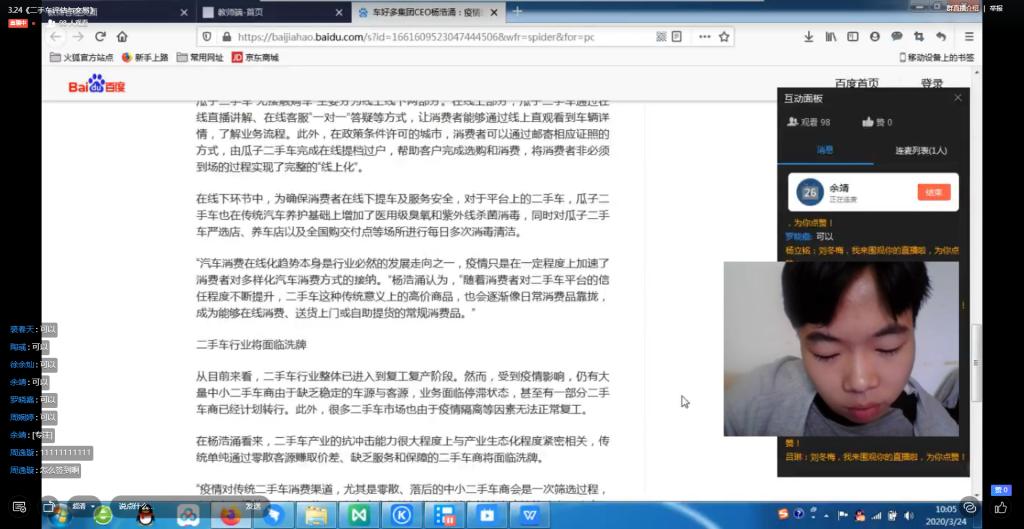 3月24日上午,汽车学院根据疫情期间在线教学工作安排,组织了一次别样的教学公开课。公开课由汽营专业教师刘冬梅主讲《二手车评估与交易》课程的“汽车外观漆面检查评估”单元,以钉钉直播讲授加互动为主、超星学习通平台活动加测试为辅的混合式在线教学形式完成了本次合班课教学,学校督导、分院领导和分院教师共计25名人员参与听课。