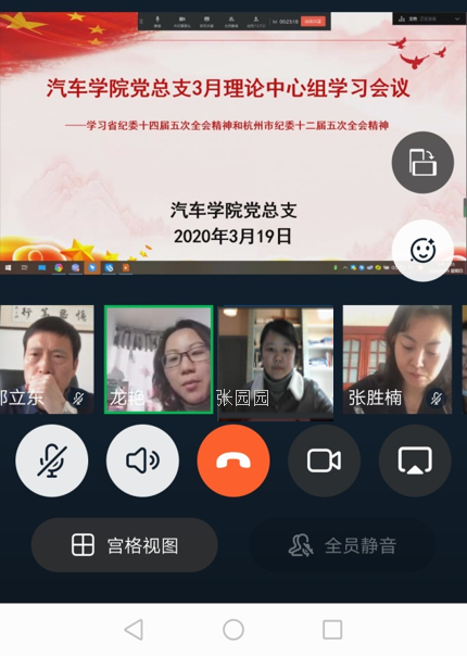 3月19日下午,汽车学院利用钉钉召开理论中心组学习视频会议,学习省纪委十四届四次全会及市纪委七届四次全会精神,经理邵立东、副书记龙艳及全体学院中层参加会议。会议由龙艳主持。