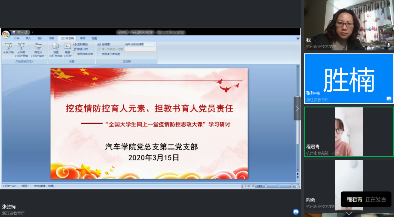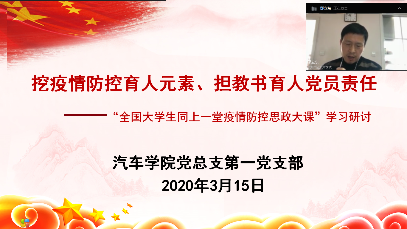 3月15日,汽车学院全体党员师生以支部钉钉视频会议形式,开展以“挖疫情防控育人元素 担教书育人党员责任”为主题的线上主题党日活动。