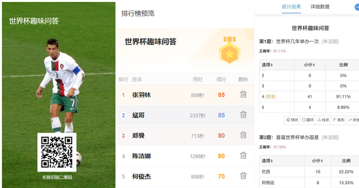 本次知识答题共15道选择题,旨在普及世界杯历史及相关足球知识,通过本次知识答题,激发了大家对足球的热情,重新唤醒了许多教职工对世界杯的青春记忆,足见世界第一运动的影响。全体教职工纷纷表示将以世界杯足球的拼博精神为指引,激发奋进之力、牢记初心使命,为推动“全民健身”贡献力量。