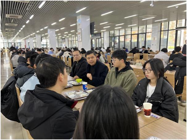 在员工食堂,师生围桌而坐,程利群与员工一起排队打饭,边吃边聊。他关切地询问员工们的学习和生活情况,勉励大家要加强学习、认真复习。要切实做好自身健康的第一责任人。