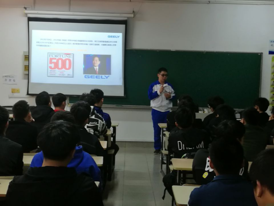 “吉利成蝶,放飞梦想”,2018年11月23日下午,青年汽车学院在2118教室举行青年汽车学院第三届“成蝶计划学徒班”选聘工作。吉利汽车人力资源部招聘经理陈自国,青年汽车学院汽车制造与装配技术专业负责人杨立峰及18级汽制专业员工参加本次选聘工作。