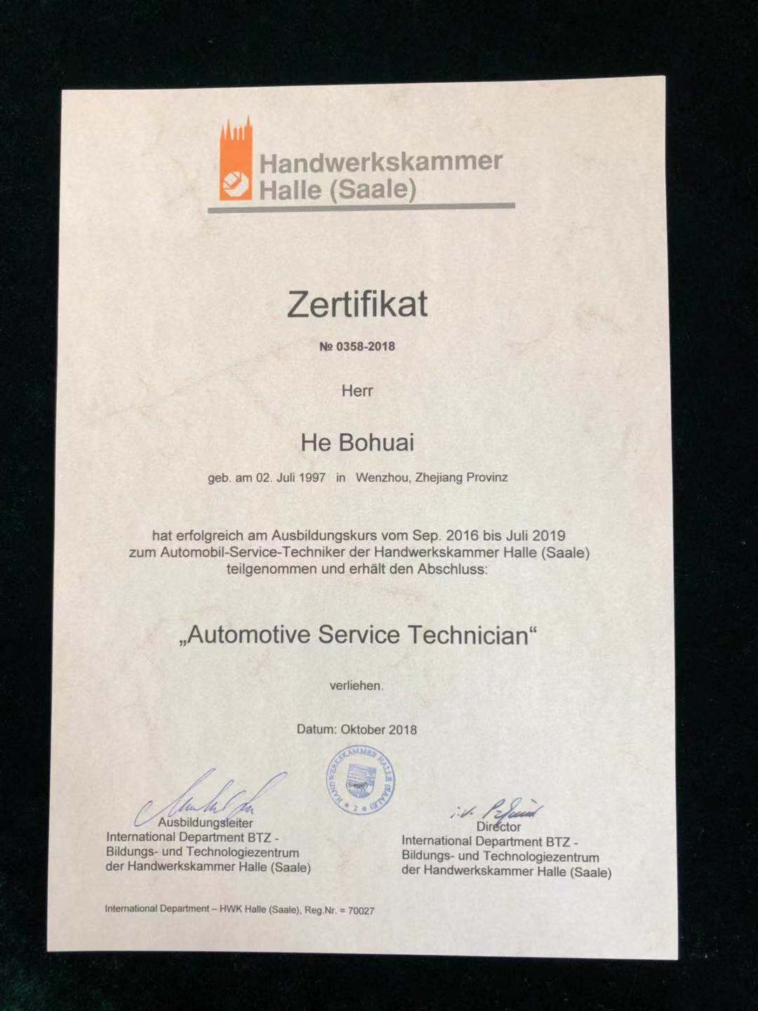 据了解,德国哈勒手工业协会考试中心是2006年开始进入中国的。10多年来,全国约有1000人通过他们的考试。数据显示德国本土的通过率为75%,20名员工参与考试并全部通过实属不易。本次考试历经两天,由1项理论考试、9项实践项目考试和1项专业面试,每位考生考试时长达520分钟。该证书是德国汽车维修业的最高级别的职业技能证书,在欧盟以及全世界都具有极高的“含金量”,是全球顶尖汽车维修的“通行证”,堪称世界汽车维修业的“诺贝尔”。