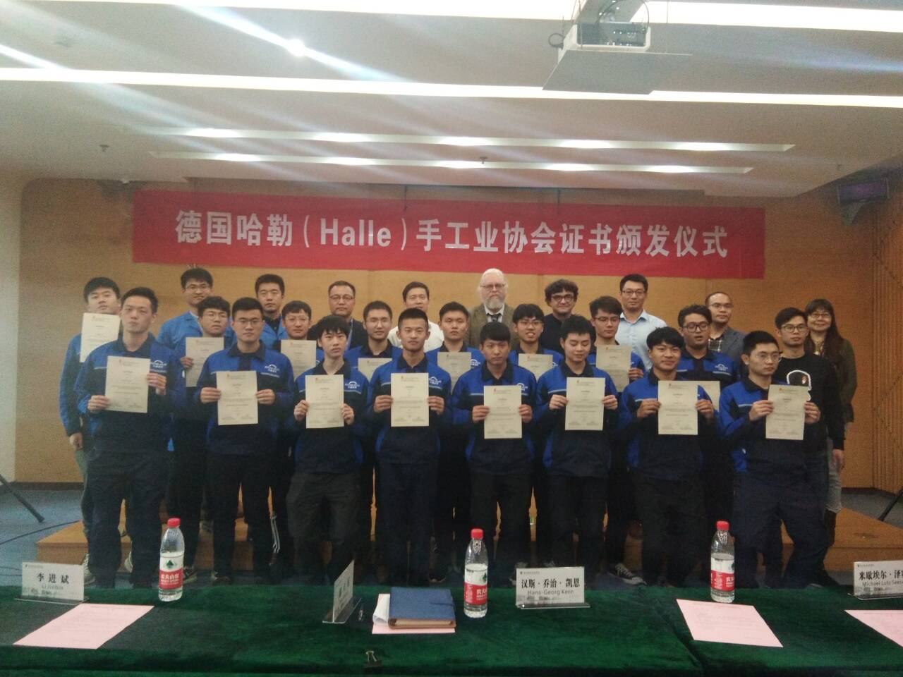10月20日下午,德国哈勒手工业协会(HWK-Halle)证书颁发仪式在图书馆第七会议室隆重举行,DCG哈勒德中协会国际学院经理汉斯·乔治· 凯恩(Hans-Georg Kern),哈勒手工业协会汽车技术专业大师米夏埃尔·路茨·泽赛(Michael Lutz Seese),中德诺浩(北京)教育投资股份有限公司运营中心学术总监张树佩、青年汽车学院经理邵立东、德国哈勒手工业协会(HWK-Halle)证书监考教师以及20位考生参加仪式,仪式由邵立东主持。