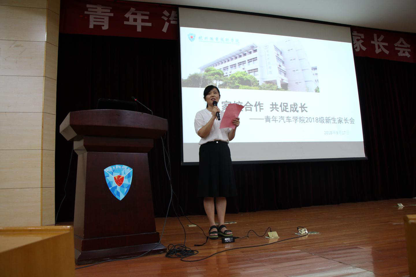 龙艳向家长们做了《家校合作共促成长》主题报告。首先对杭州职业技术学院的发展情况、办学理念、教学思路,文化育人等方面进行了介绍;对青年汽车学院的发展情况、人才培养思路、校企业合作情况以及素养培养的途径进行了深入的讲解,让家长们对学校及汽车学院有了更清晰和直观的了解。接着,龙艳针对家长们关注度较为集中的汽车专业发展、未来就业前景、工作岗位等方面问题作了详细阐述;她还从适应、学习、做人、心理、规划这五个关键词切入,与家长交流如何共同的帮助孩子明确大学规划、寻找职业兴趣、阳光快乐成长等话题。最后,龙艳代表青年汽车学院全体教职工向家长们表示,感谢家长们能放心把孩子交给我们,一定用心关注孩子的成长,家校合力培养孩子的职业能力,耐心等待他们将来的绽放。