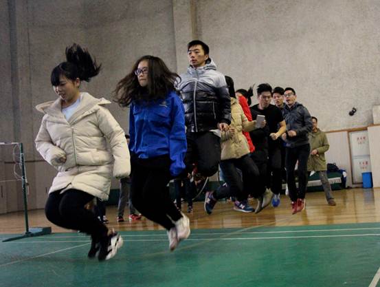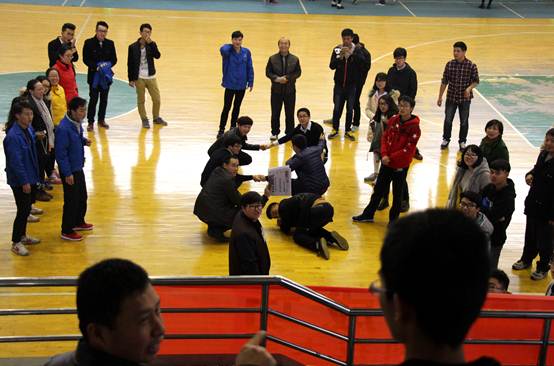 首先进行的是摆大字比赛,由队员通过肢体摆出给定的文字造型,队长负责猜字。比赛开始,参赛队员们马上进入状态,教师们放下了平时的不苟言笑,与同学们通力合作,在地上摆出一个个有趣的文字,比赛场面趣妙横生、欢笑声此起彼伏。接着是集体跳大绳,由两位队员甩绳,九位队员集体跳绳,这个项目比得就是队员间的配合和默契,经过一段时间的练习调整,各个参赛队漂亮的完成了比赛。最后一个项目是报纸接龙,师生相互合作将给定的报纸粘成滚筒状,10位队员在报纸滚筒中行走,中途报纸不得撕裂,需要队员们步调一致,齐心协力共进退,在比赛中,参赛者积极、主动,兴趣盎然,尽管有一定的难度,但都不怕困难,齐心协力完成比赛。