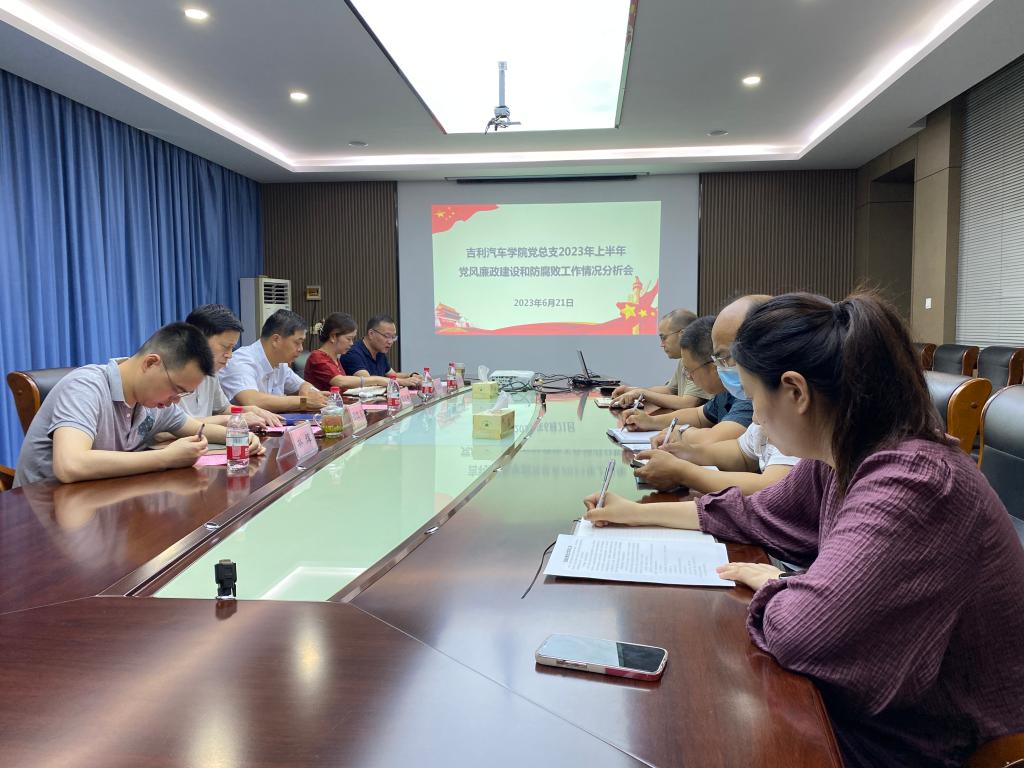 6月21日上午,吉利汽车公司党总支2023年上半年党风廉政建设和反腐败工作情况分析会在2409顺利召开。公司党委委员、副董事长程利群,校纪委委员、质评处处长戴凤微,公司党总支书记邵立东、副书记张理剑、副经理林辉以及各专业、部门负责人参加会议,会议由张理剑主持。