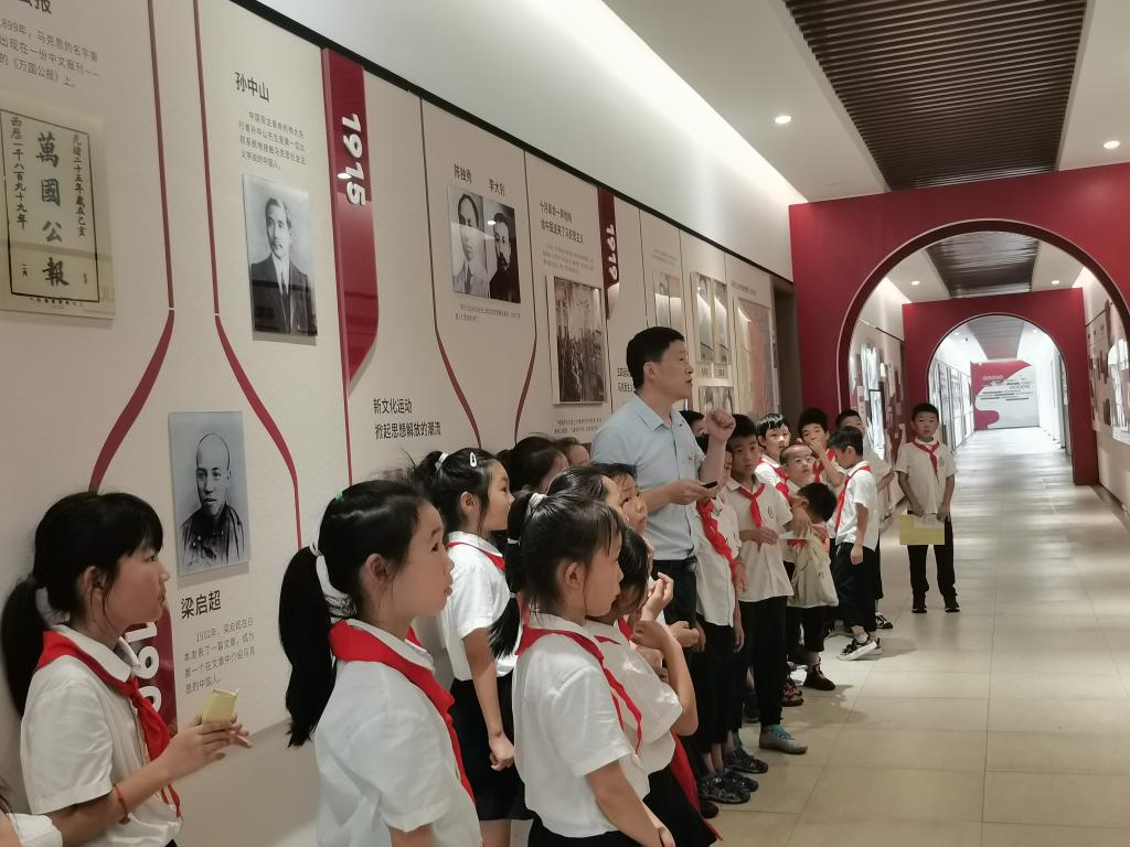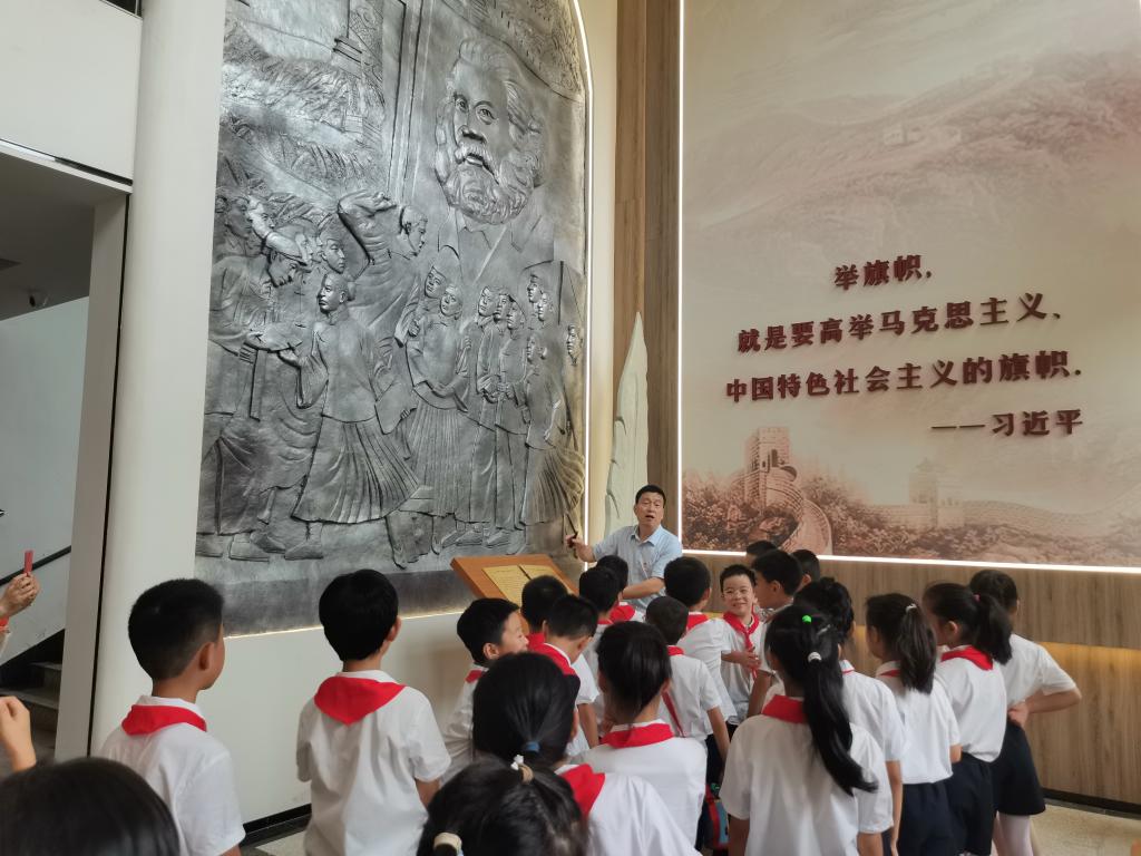 课程结束前,邵立东请孩子们总结该展馆称作“必由之路”纪念馆的原因,孩子们的积极发言得到了他的肯定,他再次强调,只有中国共产党才能团结带领中国人民从水深火热的旧中国逐渐走向如今国富民强的新中国,实现中华民族从站起来到富起来、强起来。最后邵立东指了指孩子们佩戴的红领巾和队徽,再指了指自己胸前佩戴的党徽,告诉他们:“现在你们佩戴的是红领巾和队徽,希望以后大家都能佩戴党徽。”