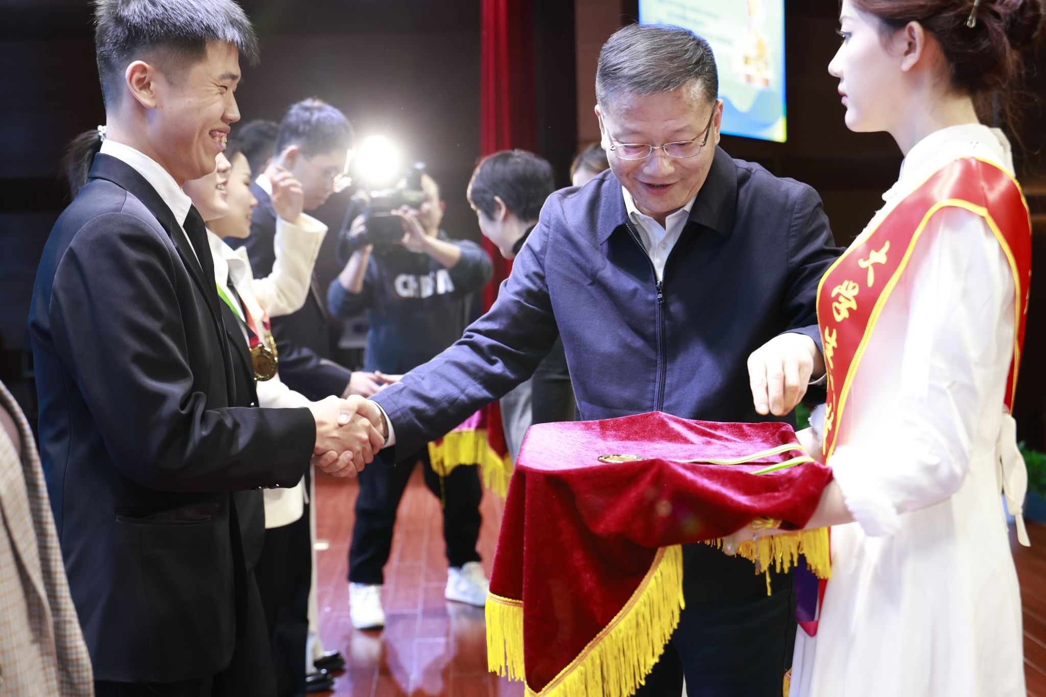 杭州市科协党组书记、主席孙雍容在颁奖典礼上致辞,指出大赛在杭州市科协等主办单位的指导下,坚持以创新引领发展,主动对接国家科技创新战略,融汇长三角科创大格局,推进优秀科创成果与园区企业资源“双向奔赴”,科创成果竞相涌现,科技人才近悦远来。赛后陈文岳书记与项目团队师生进行交流,勉励师生再接再厉,再创佳绩,并合影留念。
