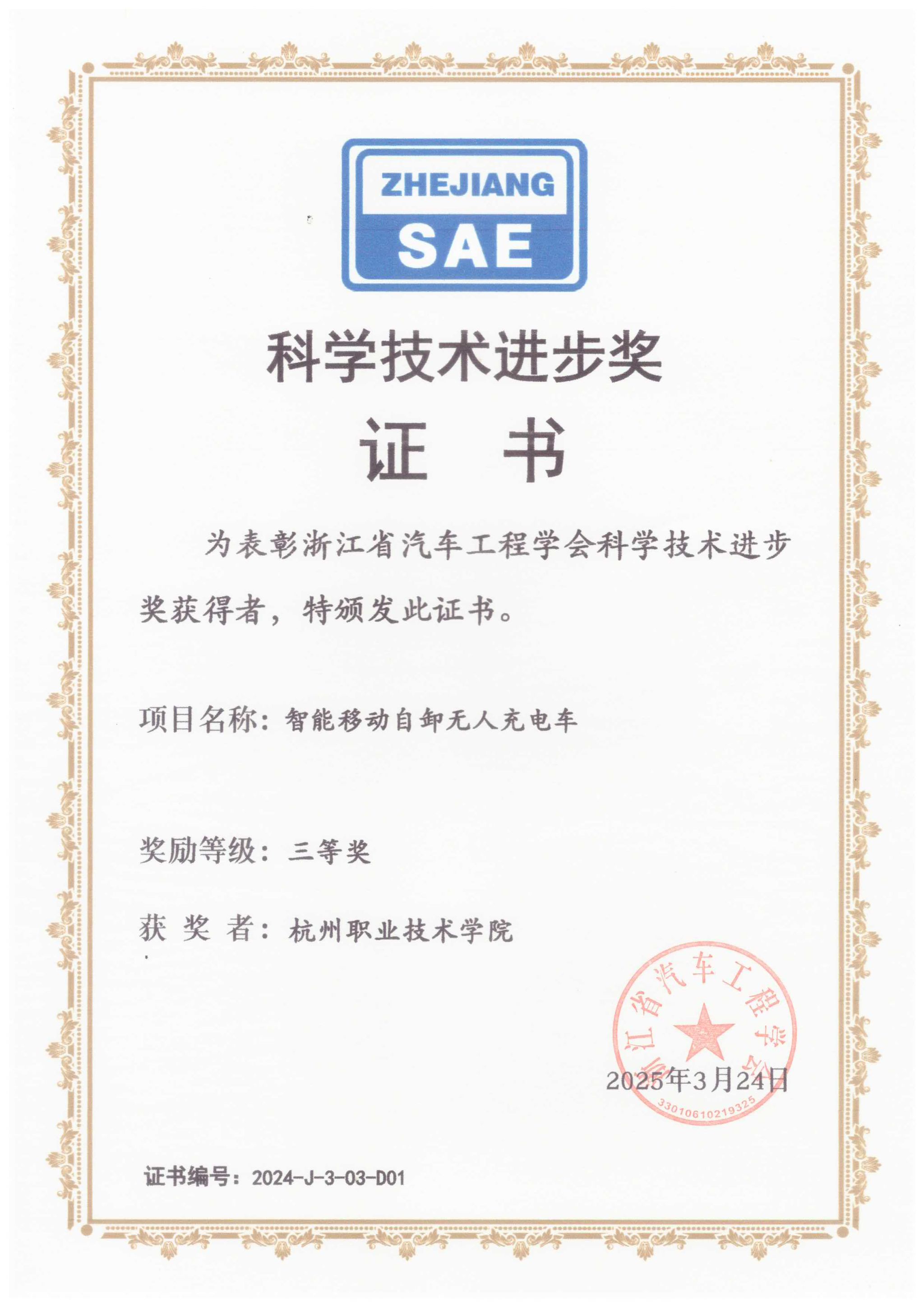 公司获评浙江省汽车工程学会2024年度学会工作先进单位,yl6809永利检测中心杨爱喜、李兰友两位老师获评2024年度学会工作先进个人。yl6809永利检测中心杨爱喜教授团队主持的《智能移动自卸无人充电车》项目以公司为第一单位获得浙江省汽车工程学会2024年度科技进步奖三等奖,参与浙江方圆检测集团股份有限公司主持的项目《新能源汽车减速器关键性能检测技术及装备的研究与应用》获得科技进步奖二等奖。