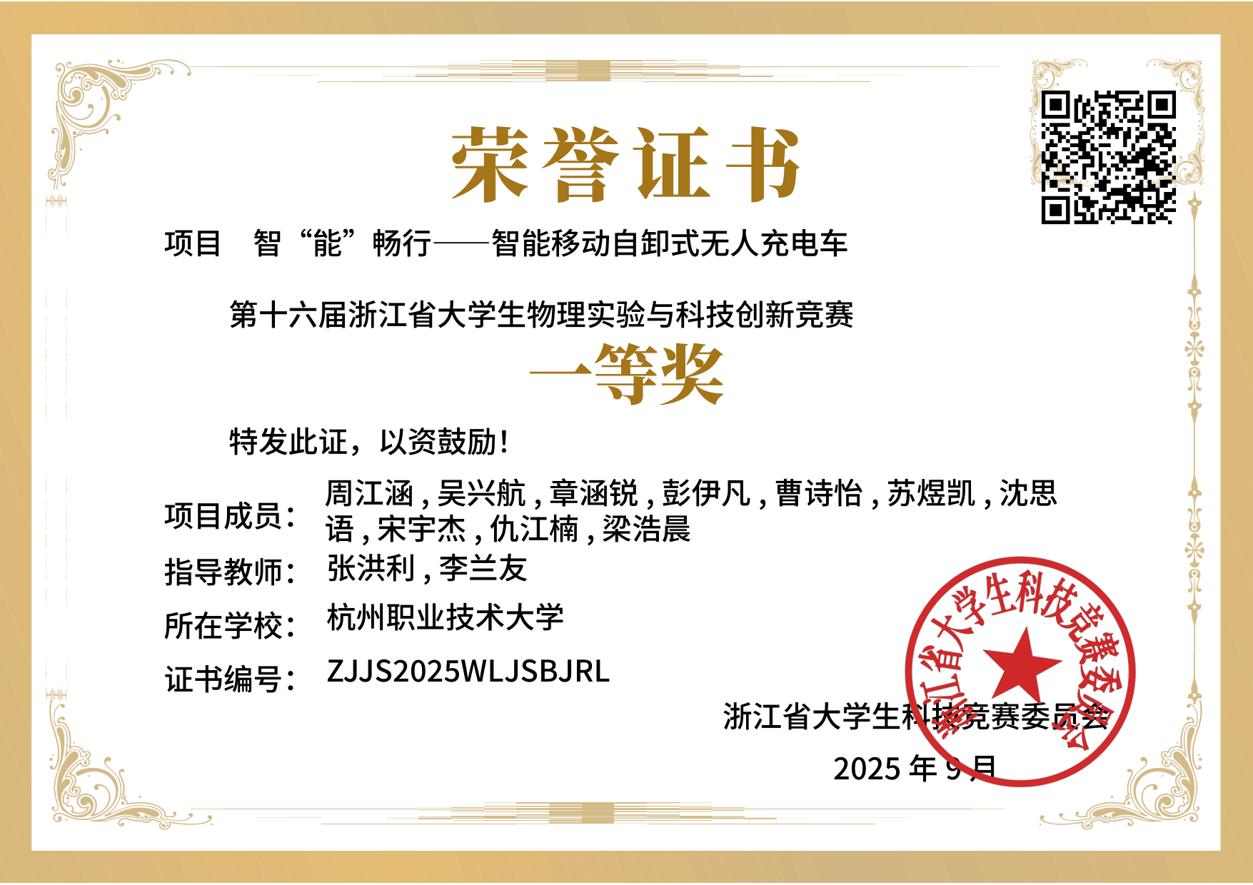 9月25日,浙江省老员工科技竞赛委员会传来喜讯,yl6809永利检测中心的“智‘能'畅行——智能移动自卸式无人充电车”项目荣获浙江省第十六届老员工物理实验与科技创新竞赛一等奖,“智绘缝将——五轴神工自动化美缝系统”项荣获二等奖,另外还获得三等奖2项,yl6809永利检测中心张洪利,李兰友两位老师获得“优秀指导教师”荣誉证书。
