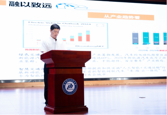 经理邵立东以《“融”入产业浪潮、“精”修匠艺本领、以青春之我驰骋汽车新未来》为主题,为全体新生讲授“经理领航课”。他对新生的到来表示热烈欢迎,向大家描绘了学院发展美好蓝图,鼓励同学以“融”为径,以“精”为道,培养专业素养、铺就专业未来。邵立东经理还提出三个深度思考问题,引导新生主动探寻专业价值,点燃对汽车领域的热爱。